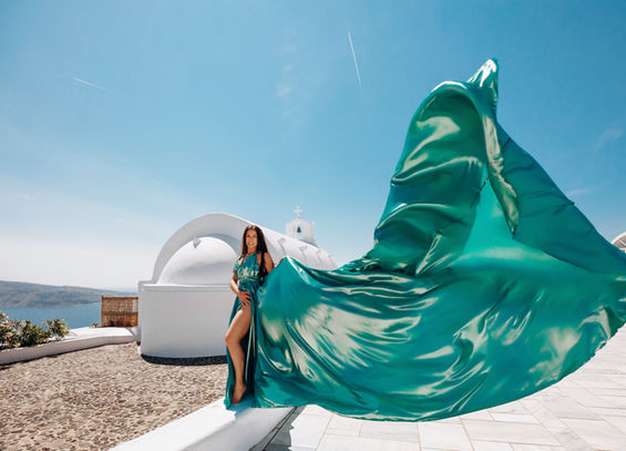 As she soared through the skies above Santorini, her vibrant SEA WAVE DRESS billowed in the wind like a flame dancing in the breeze. The breathtaking views of the island's blue waters and white-washed buildings complemented the dress's bold hue, making for a truly unforgettable experience.