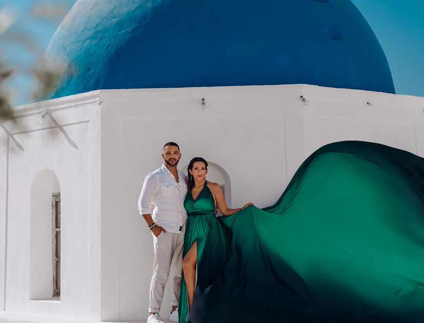 Megalochori is also one of the best locations in Santorini for flying dress photoshoots with horses, offering a unique combination of traditional village scenery and natural, emotional imagery. The contrast between the flowing dress, the calm rural environment, and the presence of horses creates powerful, editorial-style photographs that stand out from typical island shoots.